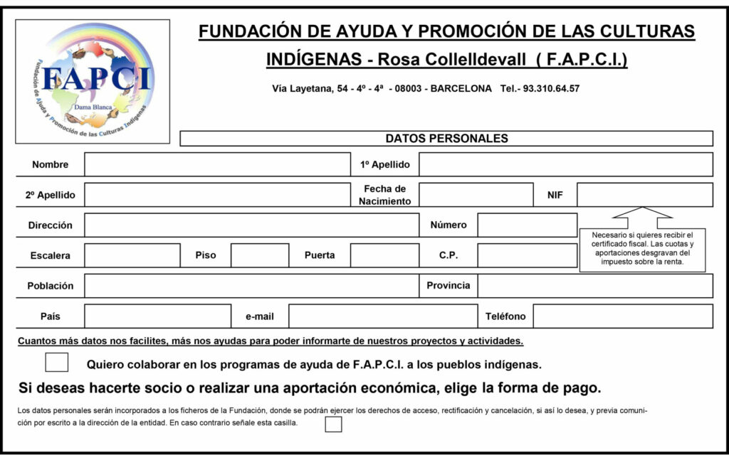 Fundadora de FAPCI (Fundación de Ayuda y Promoción de las Culturas Indígenas) en 2004, organización con la que ha llevado a cabo ayuda humanitaria en varios países de América Latina y ha desarrollado proyectos de difusión, promoción y apoyo a las culturas indígenas en diversas regiones del mundo, incluyendo América Latina, África, Asia, Oceanía, Turquía y Baluchistán (Pakistán), entre otros.